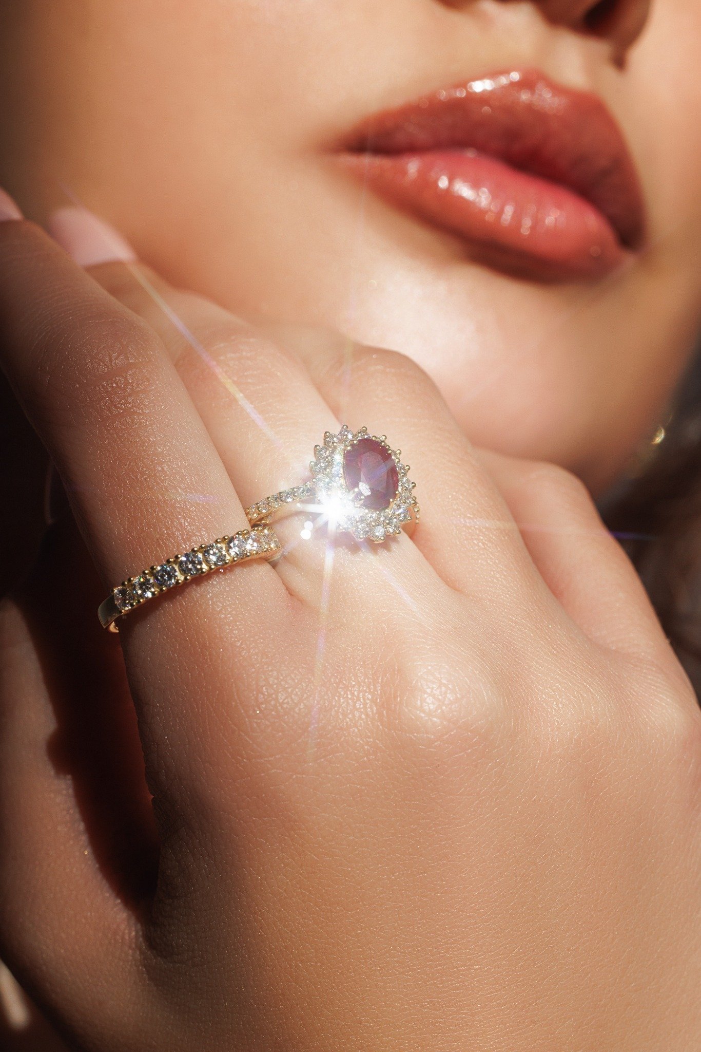 Κομψό δαχτυλίδι από χρυσό 18 καρατίων, με κεντρικό ρουμπίνι 1.36 καρατίων σε οβάλ mixed cut κοπή. Πλαισιώνεται από φυσικά διαμάντια συνολικού βάρους 0.75 καρατίων, καθαρότητας SI1, χρώματος G και με πολύ καλή κοπή. Μοναδική επιλογή πολυτέλειας και φινέτσας.