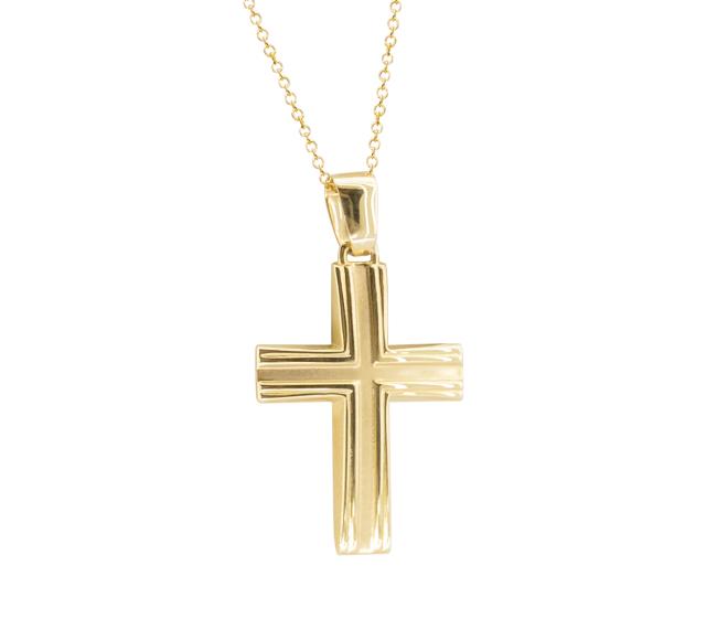 Elegant 14K gold cross with an engraved design that blends classic form with a modern touch. Perfect for everyday wear or as a symbolic gift. Comes with a 14K gold chain.