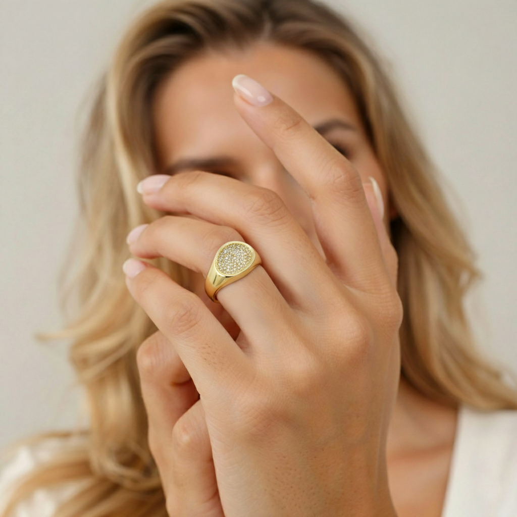 Impressive K14 gold ring adorned with sparkling zircons in a modern design. A stylish piece that combines luxury and subtle brilliance, perfect for every occasion.