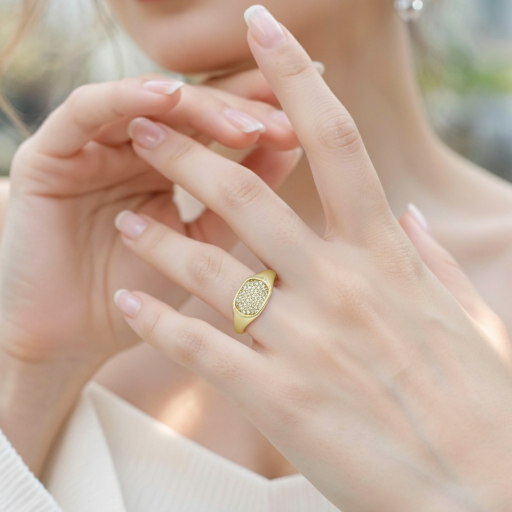 Impressive K14 gold ring adorned with sparkling zircon stones that bring refined brilliance. A sophisticated piece that radiates luxury and style.