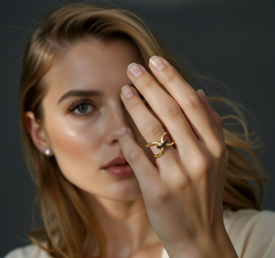 Striking and artistic, this K14 gold ring with black stones stands out for its unique design. A distinctive piece that exudes confidence and style.