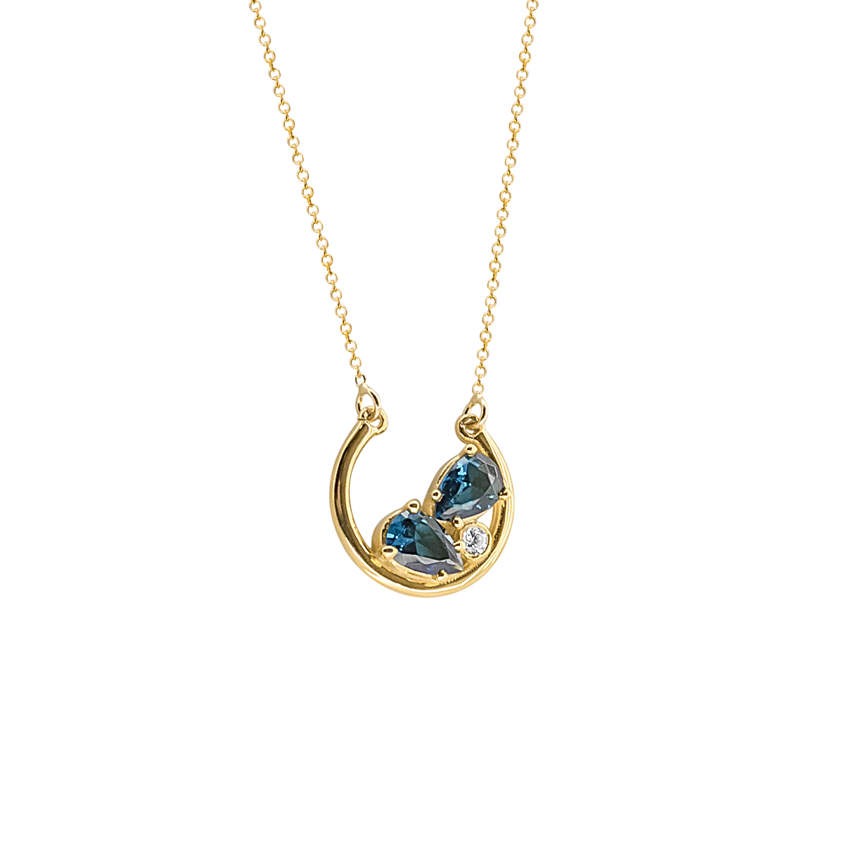 Κολιέ από χρυσό 14 καρατίων με κυκλικό μενταγιόν, διακοσμημένο με δύο μπλε λίθους σε κοπή δάκρυ και μια λευκή πέτρα στο κέντρο. Ο αρμονικός συνδυασμός των αποχρώσεων δημιουργεί μια ήρεμη, ισορροπημένη αίσθηση, ενώ η ζεστή λάμψη του χρυσού αναδεικνύει τη φυσική ομορφιά των λίθων. Ένα διακριτικό και κομψό κόσμημα για κάθε στιγμή της ημέρας.