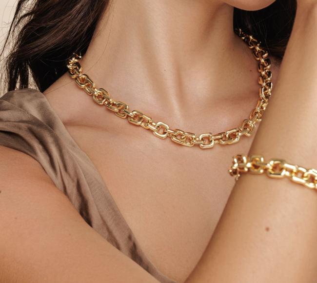 Κολιέ από χρυσό 14 καρατίων με γεωμετρική πλέξη και στιβαρή κατασκευή. Η συμμετρία των κρίκων και η γυαλιστερή επιφάνεια αποπνέουν αίσθηση ακρίβειας και πολυτέλειας, δημιουργώντας ένα statement κόσμημα με χαρακτήρα και ισχυρή παρουσία.