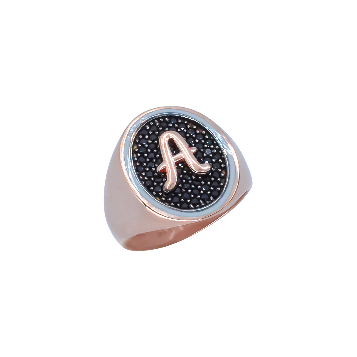 Δαχτυλίδι σεβαλιέ σε ροζ χρυσό 14 καρατίων, διακοσμημένο με μαύρα ζιρκόν, που σχηματίζουν το γράμμα 'Α'. Εξαιρετικά κομψή επιλογή που θα προσθέσει αβίαστα στυλ στην εμφάνισή σας. Σε περίπτωση που δε γνωρίζεται το νούμερο του δαχτύλου σας συμβουλευτείτε τον οδηγό μεγεθών του καταστήματός μας ώστε να επιλέξετε το νούμερο του δαχτυλιδιού σας. Παρακαλώ όπως αναφέρετε το νούμερο του δαχτυλιδιού στην ενότητα 'Σχόλια/Παρατηρήσεις' που θα βρείτε πριν την ολοκλήρωση της παραγγελίας σας.
