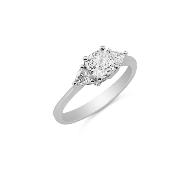 Δαχτυλίδι Κ18 με φυσικό διαμάντι cushion και πλευρικά φυσικά διαμάντια trillion