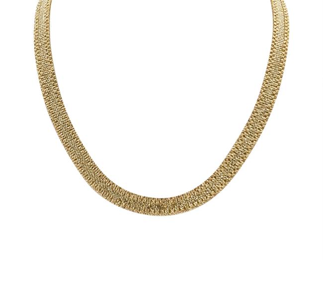 14K gold necklace with a wide, gently curved shape and a matte finish that evokes a silk-like weave. A refined piece that graces the neckline with subtle radiance and a sense of pure luxury.