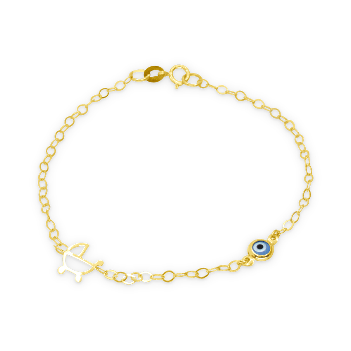 Παιδικό βραχιόλι από κίτρινο χρυσό 14 καρατίων με μάτι και καροτσάκι. Η αλυσίδα του είναι κρίκος-κρίκος και υπάρχει δυνατότητα προσαρμογής σε οποιοδήποτε σημείο επιθυμείτε.