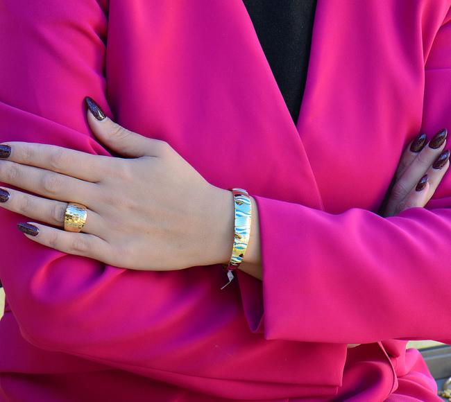 Βραχιόλι-χειροπέδα σε κίτρινο χρυσό 14 καρατίων με εντυπωσιακό σχέδιο, διακοσμημένο με τιρκουάζ και λευκό σμάλτο. Ένα κόσμημα που σίγουρα θα ολοκληρώσει υπέροχα την εμφάνισή σας.