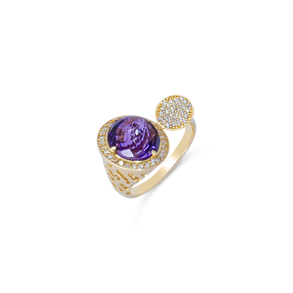 Impressive design in a 14ct. yellow gold ring with amethyst stone roundly decorated with white sapphires. Stunning and elegant piece that will compliment any outfit day and night.