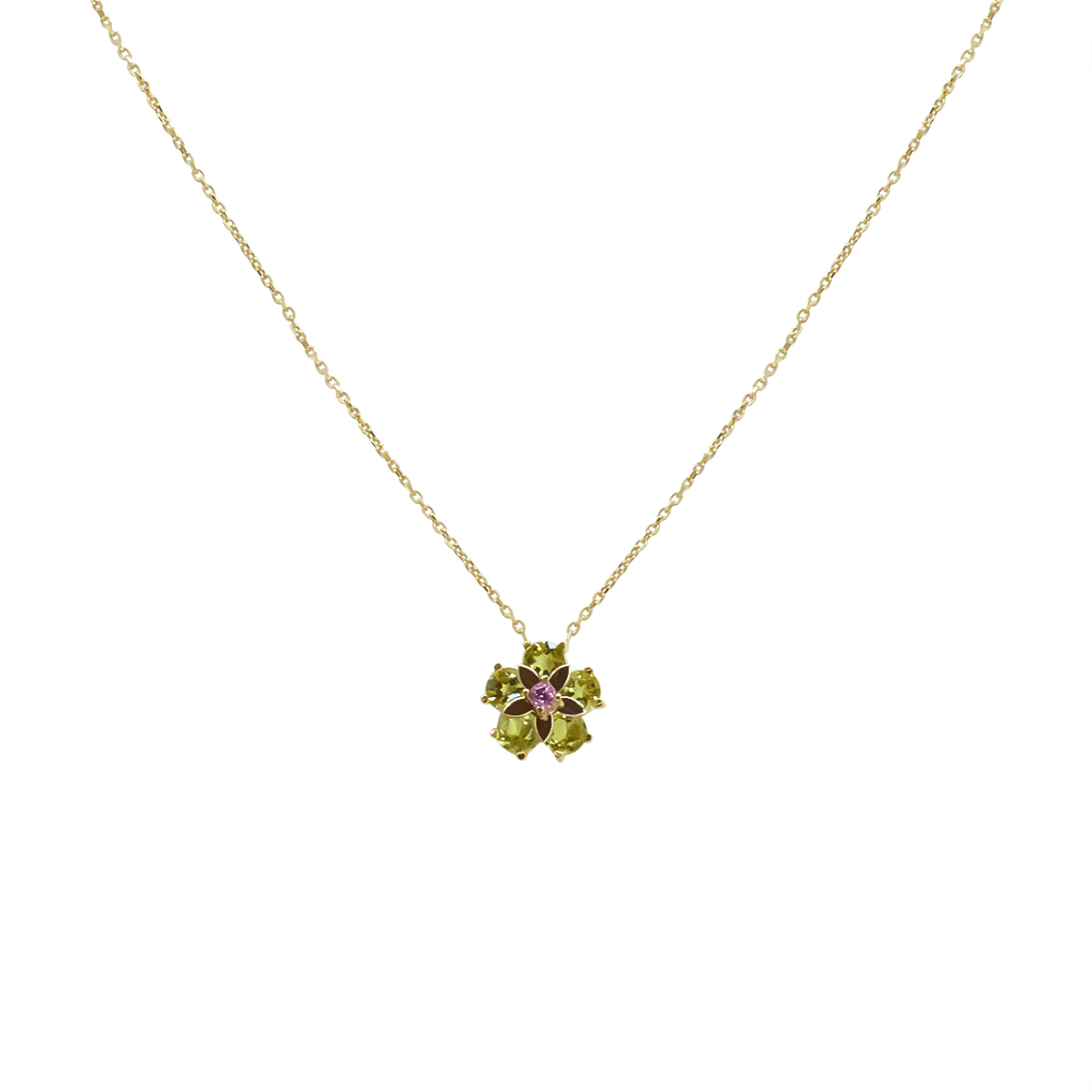 Υπέροχο κολιέ από κίτρινο χρυσό 14 καρατίων σε σχέδιο λουλούδι, διακοσμημένο με Rose Quartz και Green Topaz πέτρες. Διαχρονικό και ταυτόχρονα μοντέρνο κόσμημα που θα αναδείξει άψογα την εμφάνισή σας.