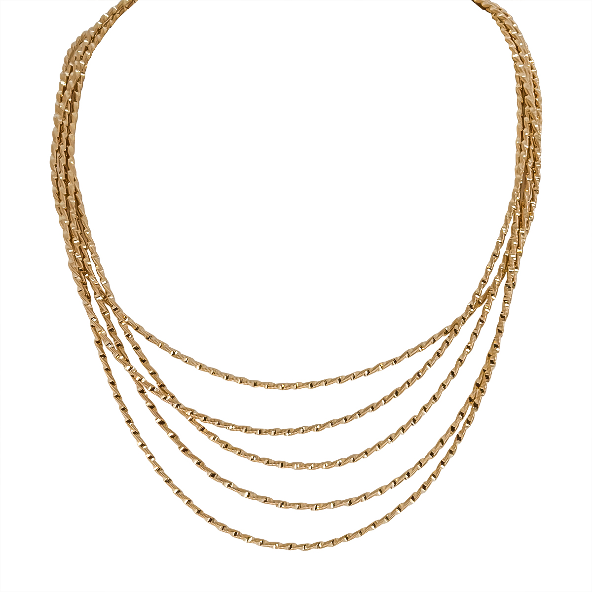 Εντυπωσιακό κολιέ από κίτρινο χρυσό 14 καρατίων. Χειροποίητο κόσμημα αποτελούμενο από 5 αλυσίδες με λουστρέ και ματ φινίρισμα. Ένα κόσμημα που θα φορεθεί σε ιδιαίτερες περιστάσεις και θα εντυπωσιάσει.