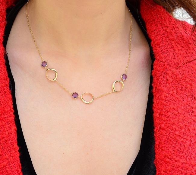 Κολιέ από κίτρινο χρυσό 14 καρατίων σε εντυπωσιακό σχέδιο, διακοσμημένο με πέτρες Αμέθυστου. Διαχρονικό και ταυτόχρονα μοντέρνο κόσμημα, διαμορωμένο με υψηλή αισθητική, θα αναδείξει άψογα την εμφάνισή σας.