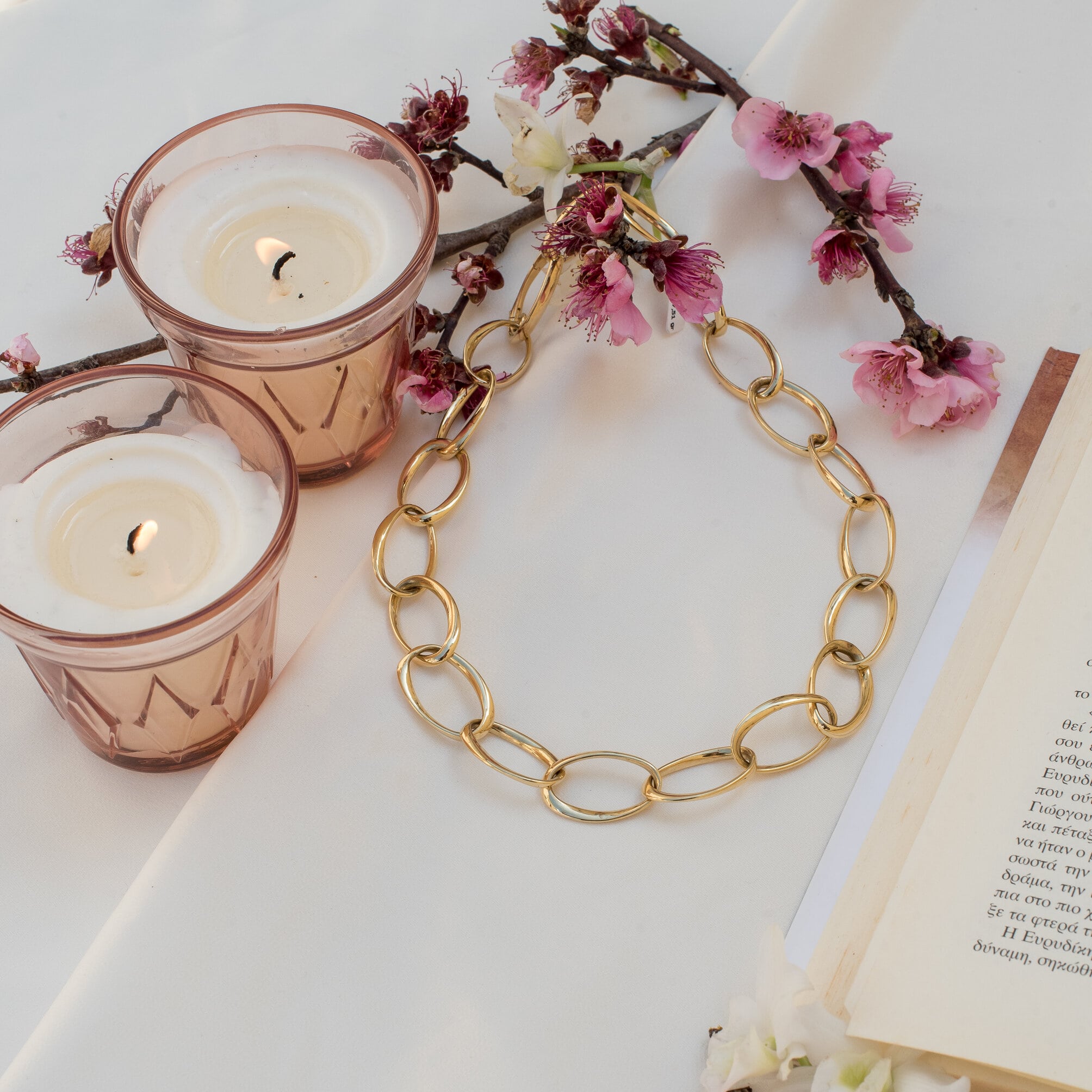Κολιέ από κίτρινο χρυσό 18 καρατίων σε κομψό συνδυασμό από οβάλ κρίκους. Κομμάτι ικανό από μόνο του να αναδείξει με τον πιο εντυπωσιακό τρόπο κάθε σας εμφάνιση.