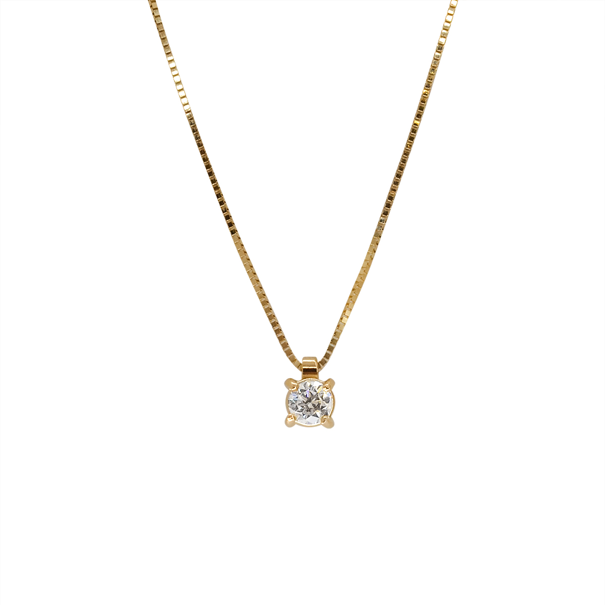 Εξαιρετικά κομψό κολιέ σε κίτρινο χρυσό 18 καρατίων με μπριγιάν 0,15ct., καθαρότητας VS1 και χρώματος G. Το μήκος της αλυσίδας είναι 45cm. Το κόσμημα συνοδεύεται από εγγύηση πιστοποίησης.