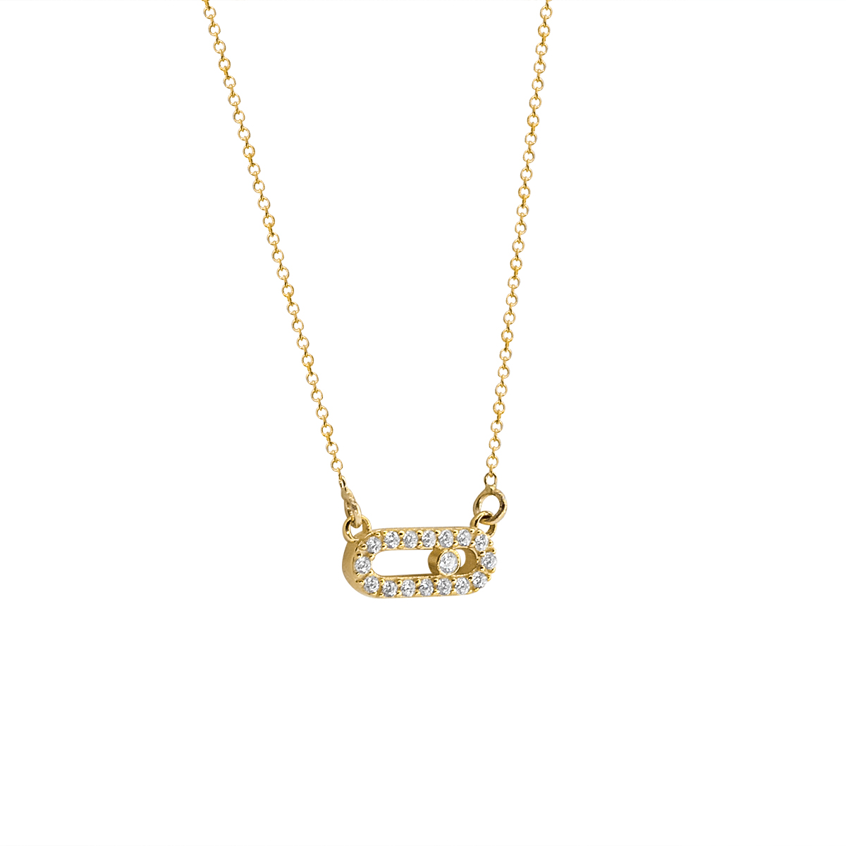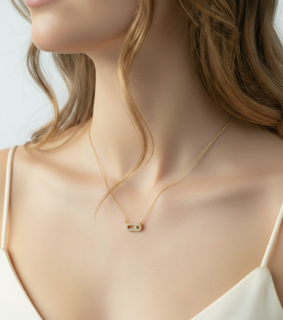 Κολιέ από χρυσό 14 καρατίων με ορθογώνιο μενταγιόν σε σχήμα κρίκου, στολισμένο με λευκές πέτρες που προσθέτουν διακριτική λάμψη. Ο minimal σχεδιασμός του συνδυάζει κομψότητα και μοντέρνα αισθητική, καθιστώντας το ιδανικό για καθημερινή χρήση ή για layering με άλλα λεπτά κοσμήματα. Ένα διαχρονικό κομμάτι με διακριτικό χαρακτήρα και εκλεπτυσμένη λάμψη.