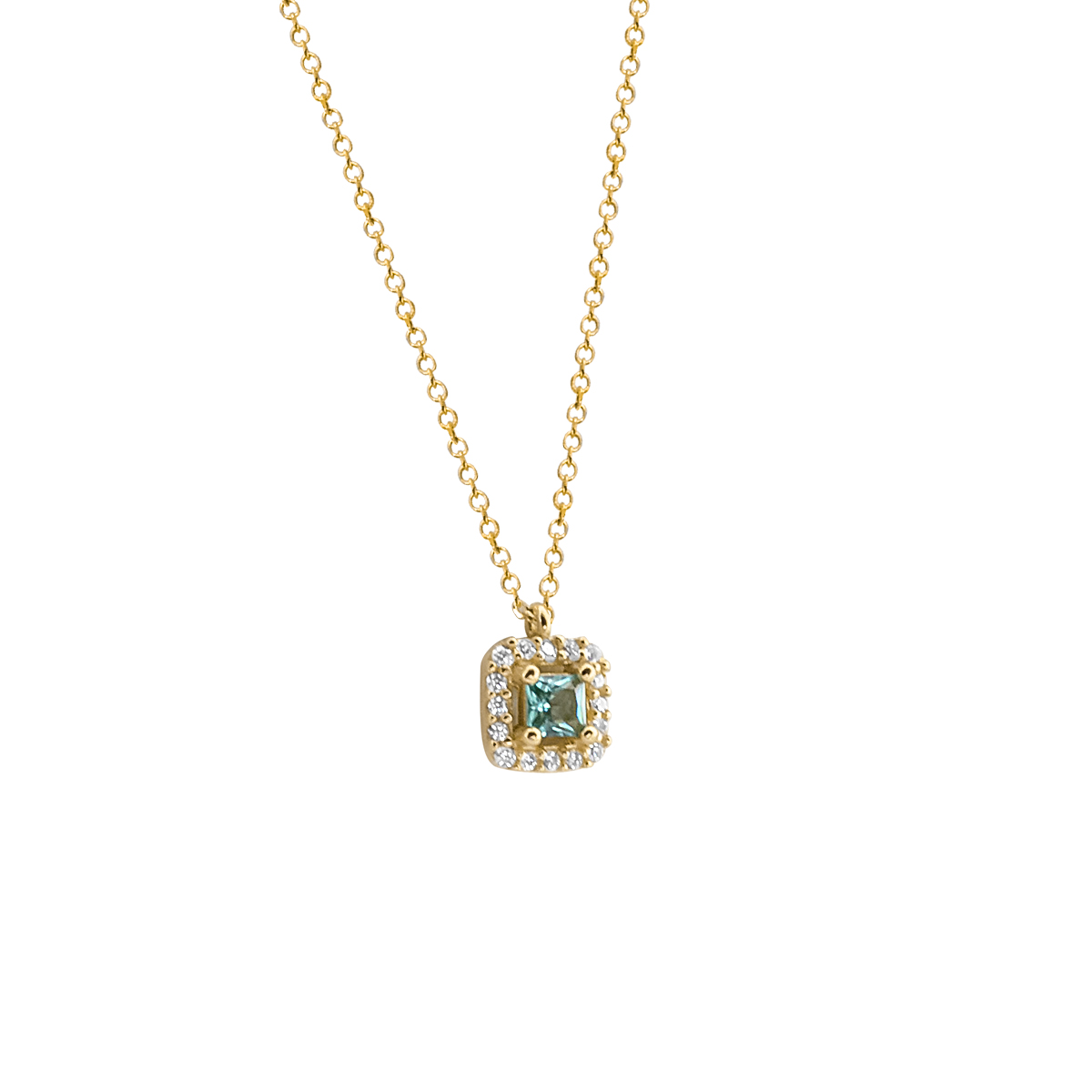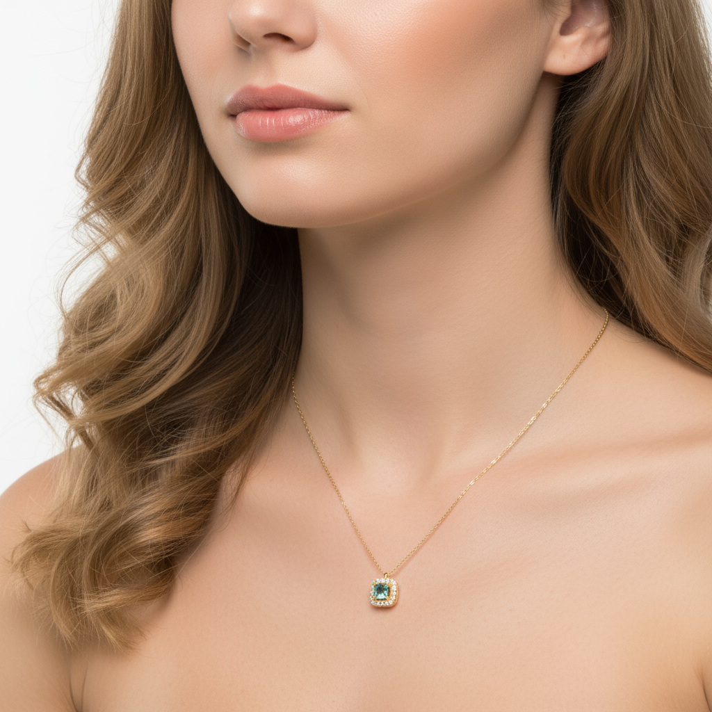 Κολιέ από χρυσό 14 καρατίων με τετράγωνο μενταγιόν, διακοσμημένο με πράσινη πέτρα στο κέντρο και πλαίσιο από λευκές πέτρες που προσθέτουν λάμψη. Ο σχεδιασμός του ισορροπεί ανάμεσα στη διαχρονική κομψότητα και τη σύγχρονη αισθητική, ενώ η λεπτή αλυσίδα αναδεικνύει διακριτικά το μενταγιόν. Ένα φωτεινό κόσμημα που δίνει μια εκλεπτυσμένη πινελιά σε κάθε εμφάνιση.