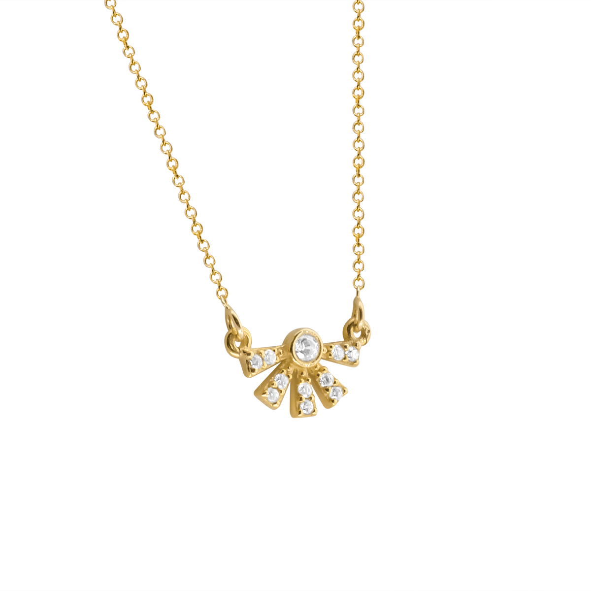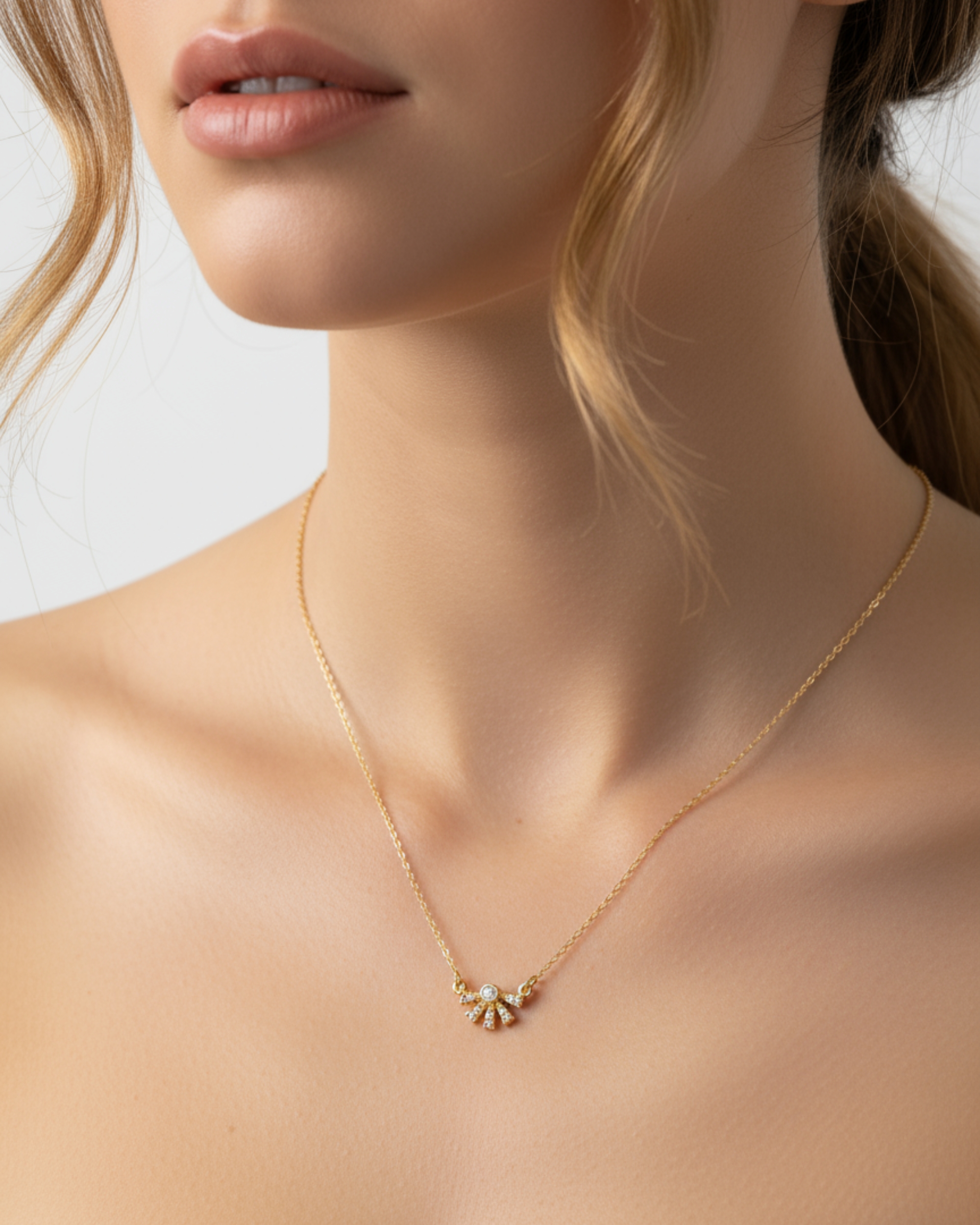 Κολιέ από χρυσό 14 καρατίων με μενταγιόν σε σχήμα ηλιακής ακτίνας, στολισμένο με λευκές πέτρες που αναδεικνύουν τη λάμψη του χρυσού. Ο λεπτός σχεδιασμός του αποπνέει φως και θετική ενέργεια, συνδυάζοντας κομψότητα και σύγχρονη αισθητική. Ένα κόσμημα που φωτίζει διακριτικά κάθε εμφάνιση, ιδανικό για καθημερινή χρήση.