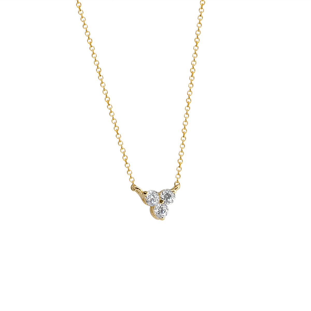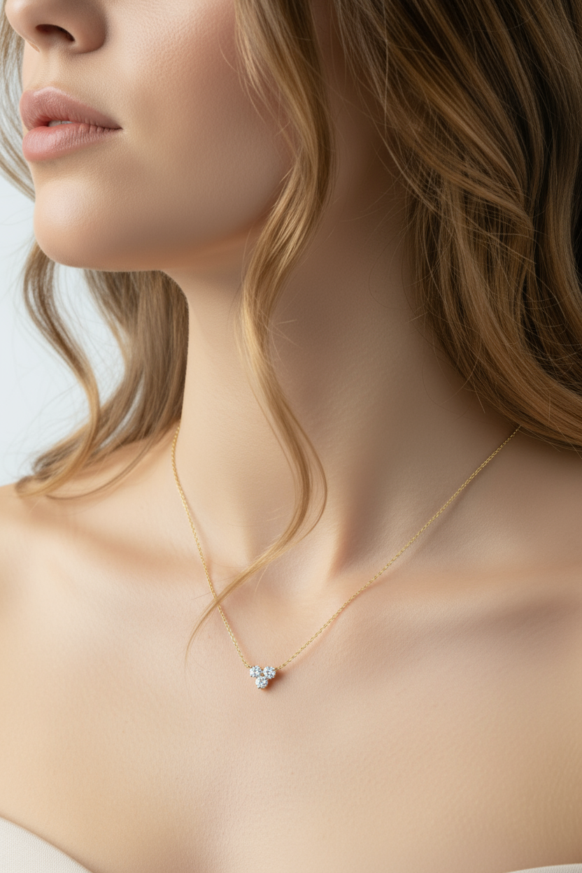 Κολιέ από χρυσό 14 καρατίων με μενταγιόν διακοσμημένο με τρεις λευκές πέτρες που σχηματίζουν ένα φωτεινό τρίγωνο. Ο σχεδιασμός του συνδυάζει λεπτότητα και ισορροπία, αναδεικνύοντας τη φυσική λάμψη του χρυσού και των λίθων. Ένα κομψό κόσμημα που προσαρμόζεται εύκολα σε κάθε στυλ και περίσταση.