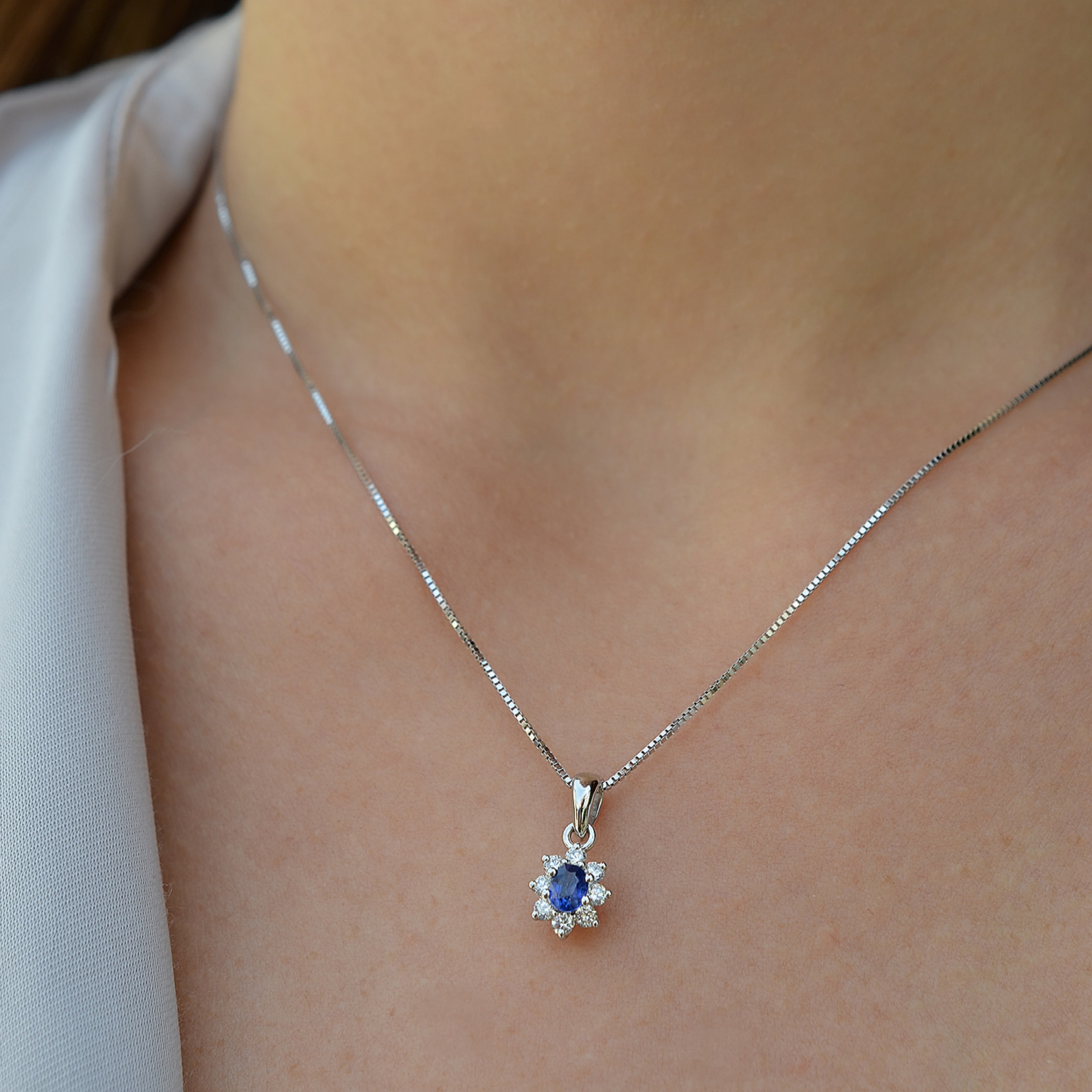 Κολιέ σε λευκό χρυσό 18 καρατίων διακοσμημένο με ζαφείρι 0,22 ct. και μπριγιάν 0,24 ct., καθαρότητας VVS1 και χρώματος E. Το κόσμημα συνοδεύεται από εγγύηση πιστοποίησης.