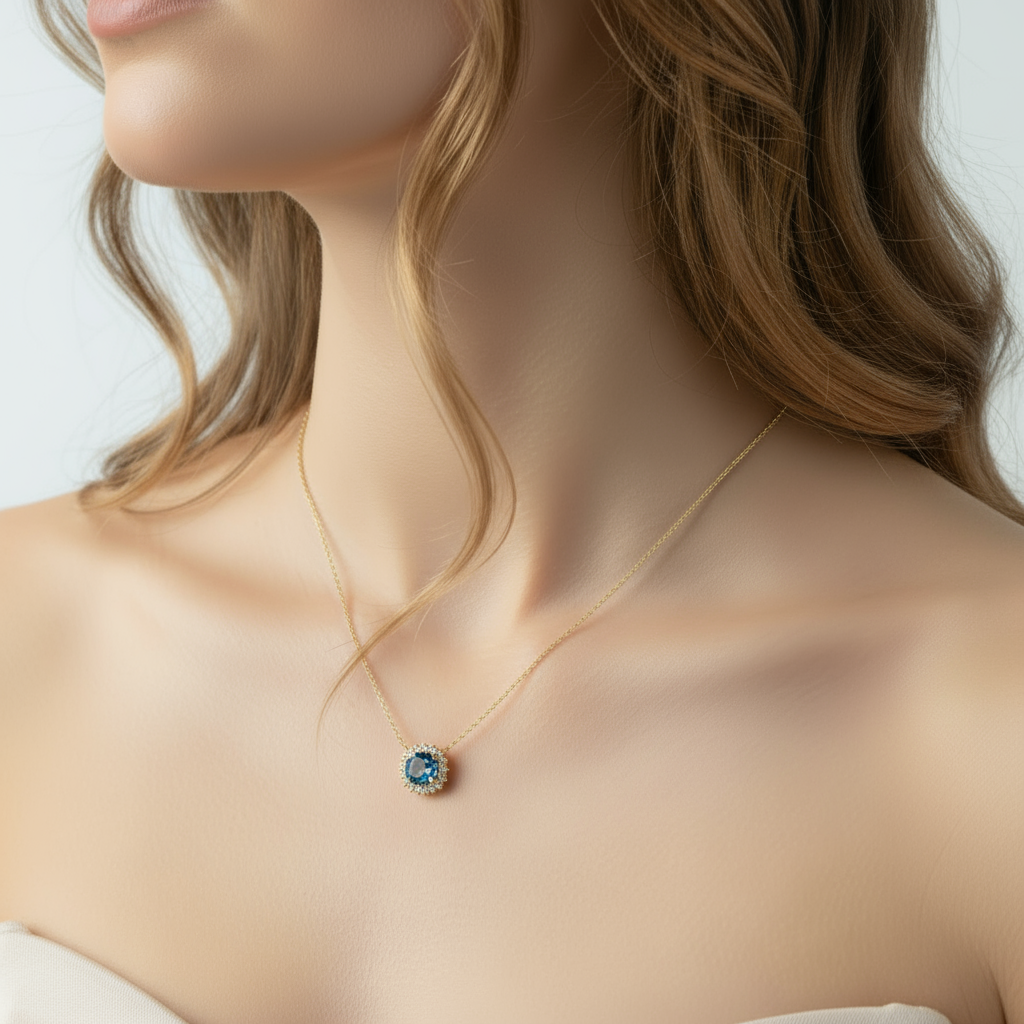 Εντυπωσιακό κολιέ από χρυσό 18 καρατίων, διακοσμημένο με London Blue Topaz κοπής Cushion, συνολικού βάρους 1.12 καρατίων, με άψογη καθαρότητα (Eye Clean). Το σχέδιο περιβάλλεται από φυσικά διαμάντια συνολικού βάρους 0.18 καρατίων, καθαρότητας VS1, χρώματος G και εξαιρετικού φινιρίσματος (Very Good). Ένα κόσμημα που συνδυάζει τη διαχρονική λάμψη με τη βαθιά απόχρωση του μπλε, ιδανικό για κάθε ξεχωριστή περίσταση.