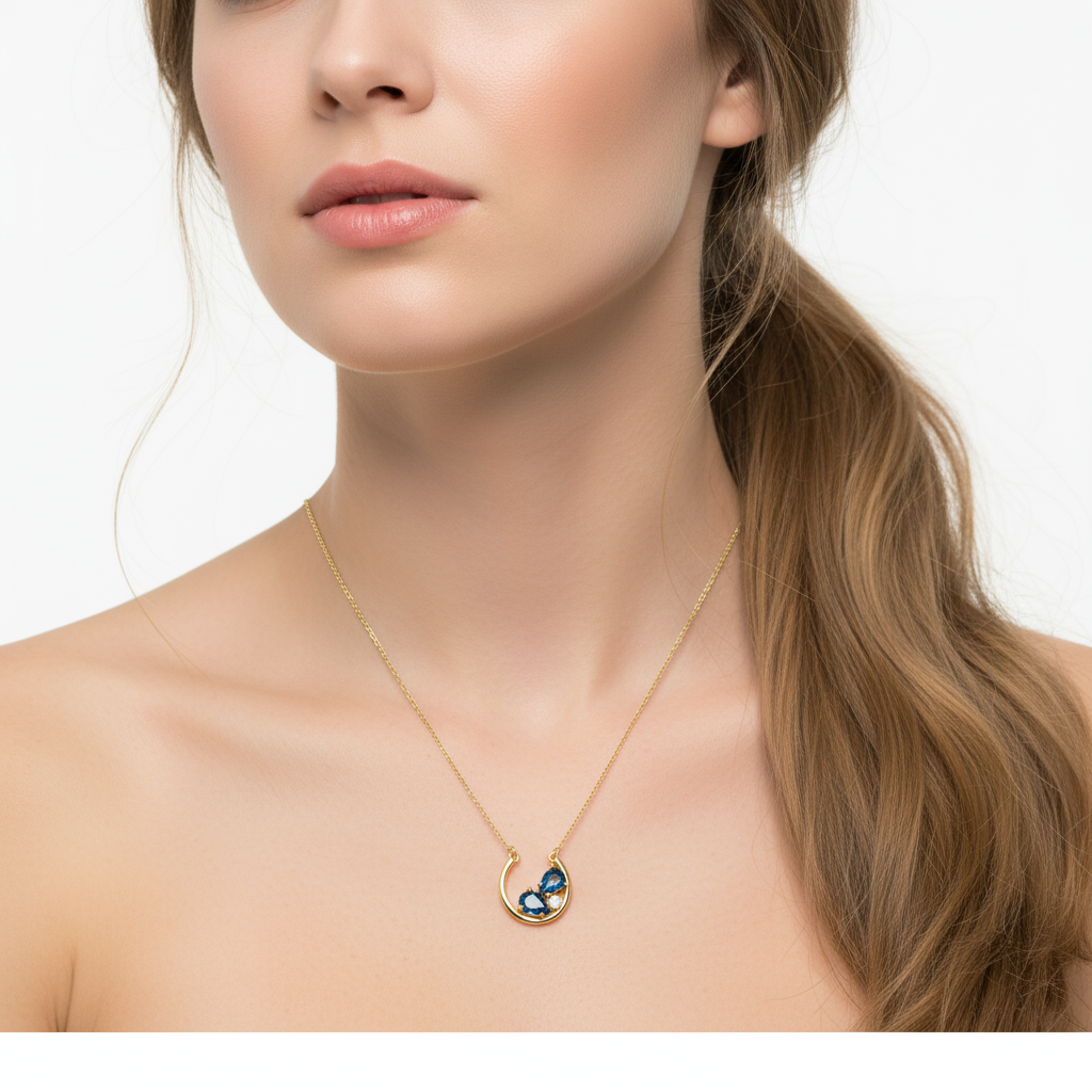 Κολιέ από χρυσό 14 καρατίων με κυκλικό μενταγιόν, διακοσμημένο με δύο μπλε λίθους σε κοπή δάκρυ και μια λευκή πέτρα στο κέντρο. Ο αρμονικός συνδυασμός των αποχρώσεων δημιουργεί μια ήρεμη, ισορροπημένη αίσθηση, ενώ η ζεστή λάμψη του χρυσού αναδεικνύει τη φυσική ομορφιά των λίθων. Ένα διακριτικό και κομψό κόσμημα για κάθε στιγμή της ημέρας.