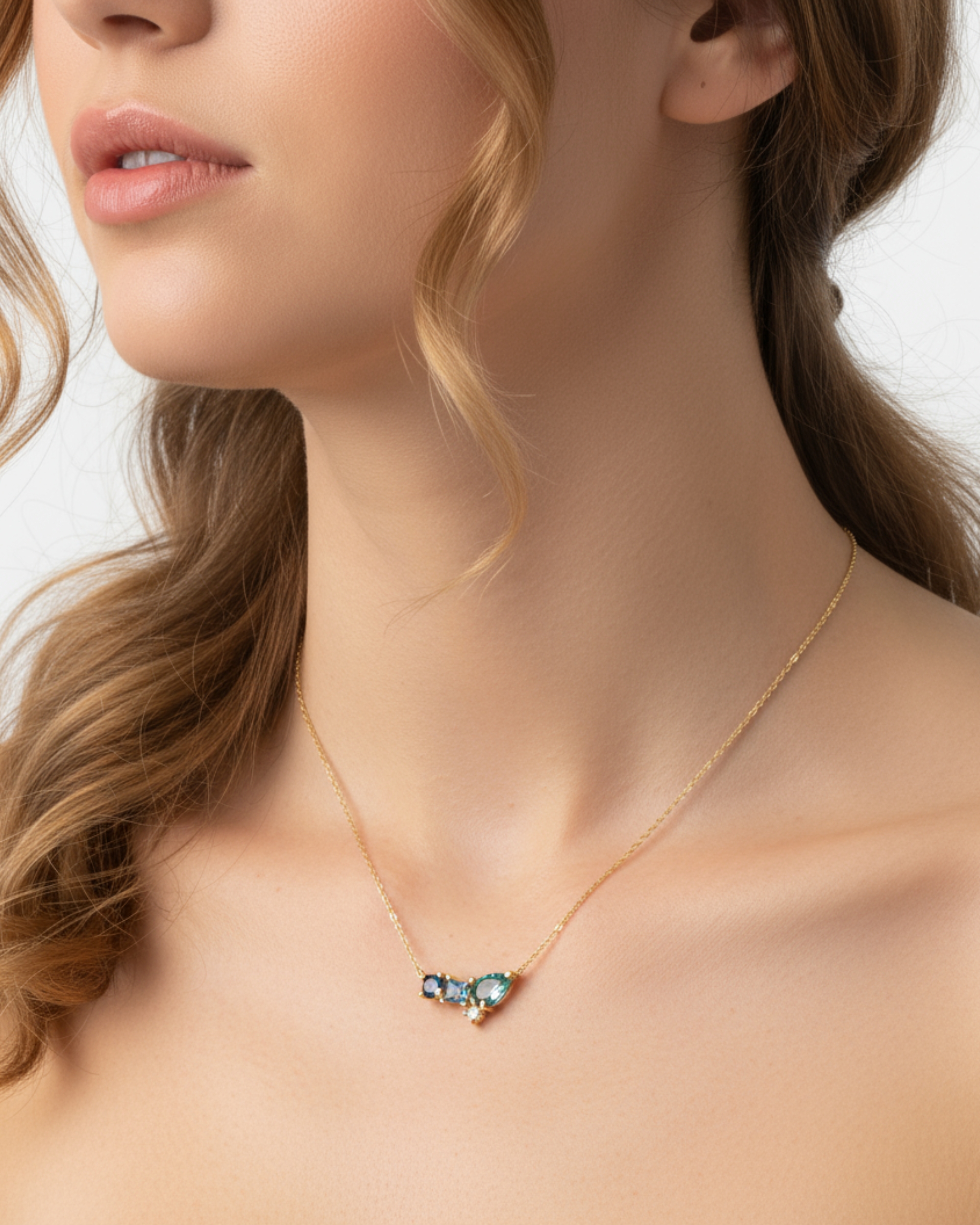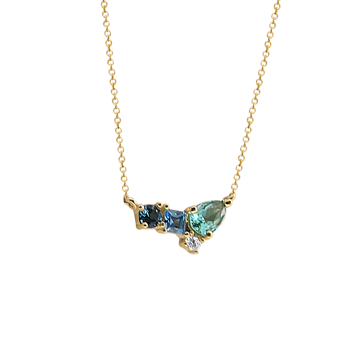 Κολιέ από χρυσό 14 καρατίων με μενταγιόν στολισμένο με πέτρες σε διαφορετικές κοπές και αποχρώσεις του μπλε και του πράσινου. Οι γεωμετρικές γραμμές και οι φυσικές λάμψεις των λίθων δημιουργούν ένα μοναδικό παιχνίδι φωτός, αναδεικνύοντας τη ζεστασιά του χρυσού. Ένα σύγχρονο και εκλεπτυσμένο κόσμημα που προσθέτει χρώμα και κομψότητα σε κάθε εμφάνιση.