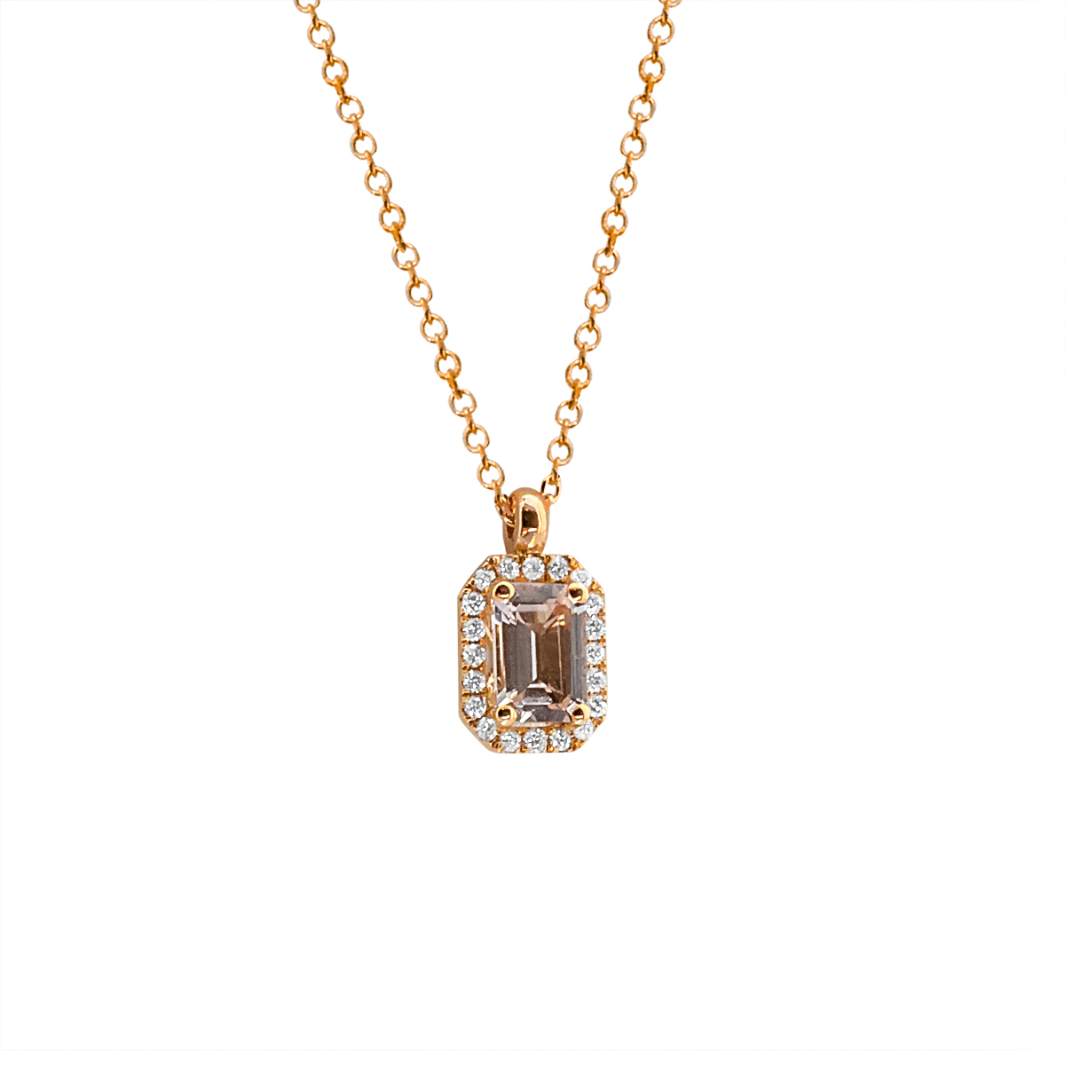 Κομψό μενταγιόν από χρυσό Κ18 με φυσική Morganite 0.49ct, διακοσμημένο με φυσικά διαμάντια 0.10ct SI1 G. Ένα εκλεπτυσμένο κόσμημα που συνδυάζει τη ροδακινί λάμψη της Morganite με τη διαχρονική λάμψη των διαμαντιών.