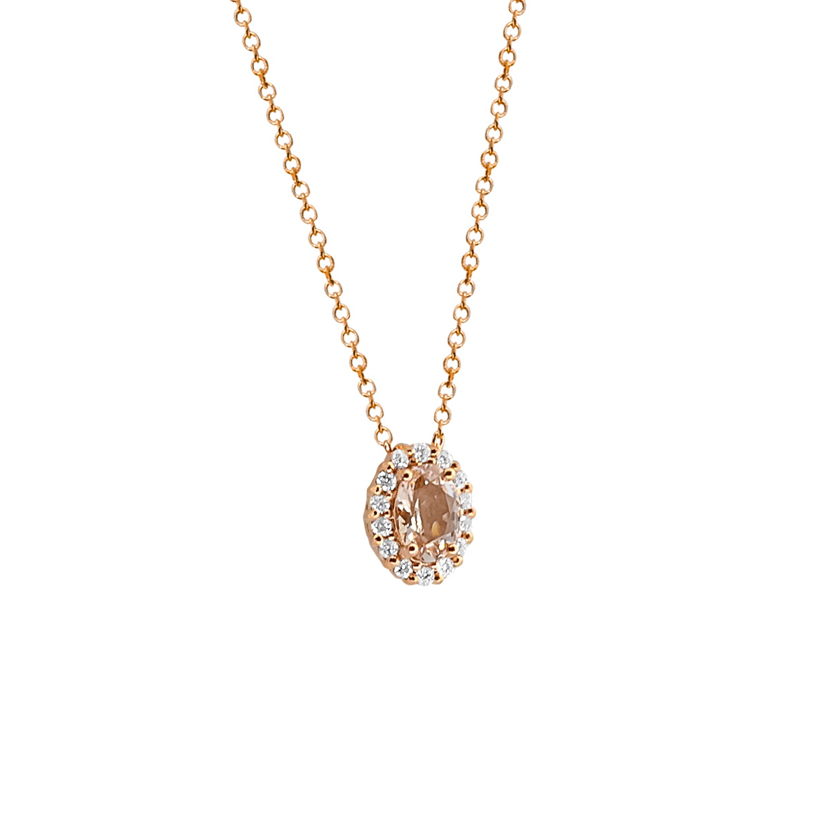 Κομψό μενταγιόν από ροζ χρυσό Κ18 με φυσική Morganite 0.36ct, περιτριγυρισμένο από φυσικά διαμάντια 0.10ct SI1 G. Ένα εκλεπτυσμένο κόσμημα που συνδυάζει τη ρομαντική απόχρωση του ροζ χρυσού με τη λάμψη της Morganite και των διαμαντιών.