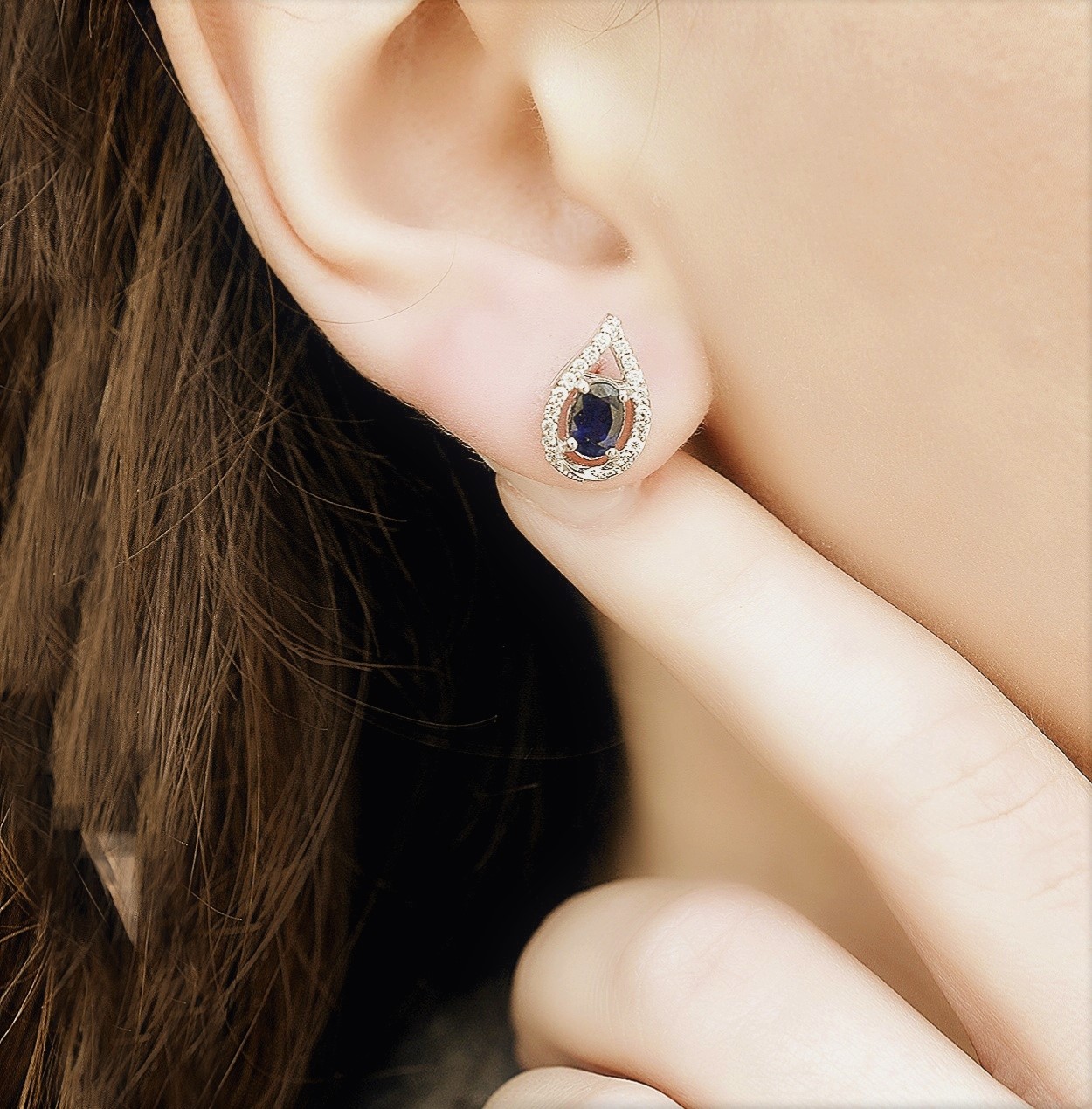 Σκουλαρίκια από λευκόχρυσο 18 καρατίων σε σχήμα 'δάκρυ', διακοσμημένα με ζαφείρια 1,18 ct. και μπριγιάν 0,26 ct. καθαρότητας VS1 και χρώματος F. Τα κοσμήματα συνοδεύονται από εγγύηση πιστοποίησης.
