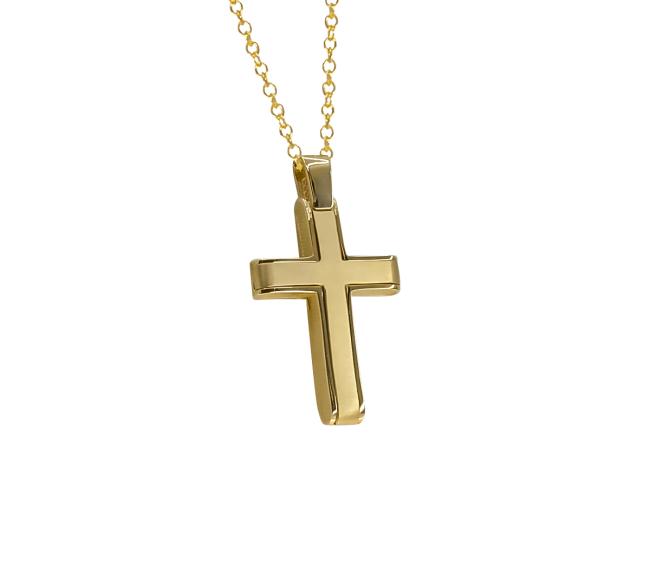 Σταυρός σε κίτρινο χρυσό 14 καρατίων με κομψή αλυσίδα μήκους 55cm.Ένα ιδιαίτερο και συμβολικό δώρο που θα εντυπωσιάσει .Ιδανική επιλογή και για βάπτιση.