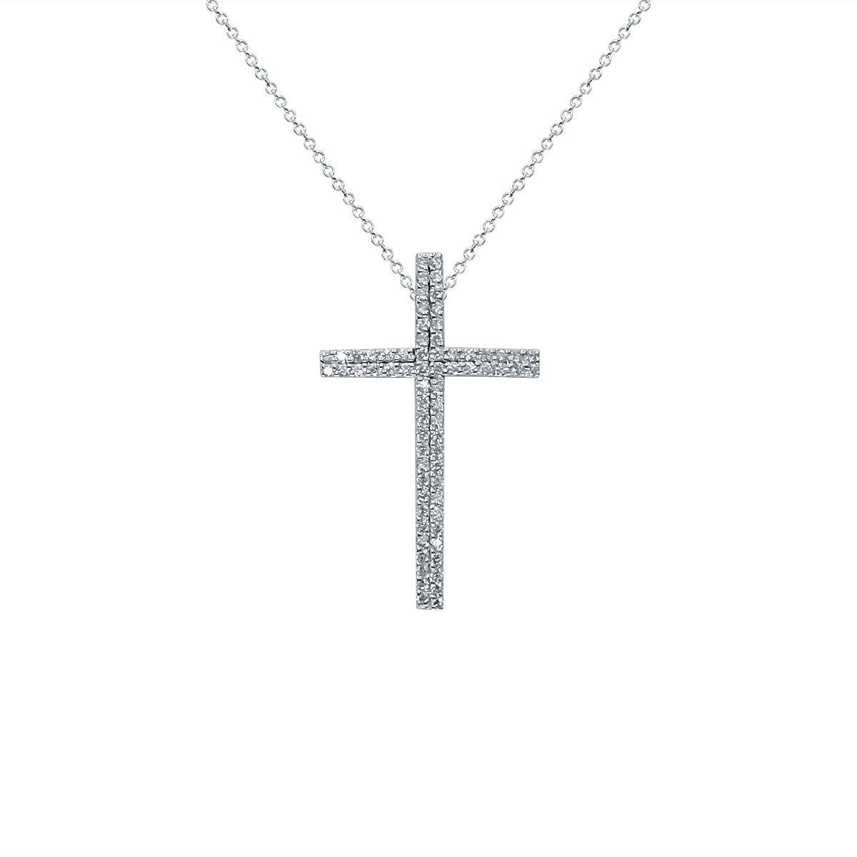 Εντυπωσιακός σταυρός σε λευκό χρυσό 14 καρατίων, διακοσμημένος με λευκές πέτρες ζιρκόν.Συνοδεύεται από αλυσίδα 14 καρατίων, μήκους 40 cm. Εξαιρετικά κομψή επιλογή που θα ολοκληρώσει άψογα κάθε σας εμφάνιση.